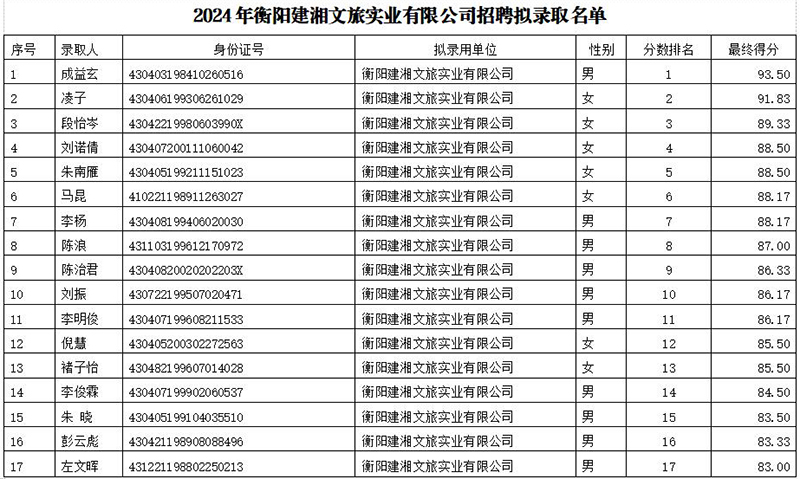 2024衡陽建湘文旅實業有限公司面向社會公開招聘擬錄取人員名單公示