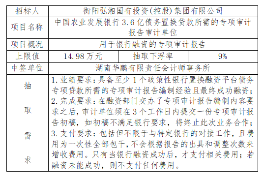 ?    中國農業發展銀行3.6億債務置換貸款所需的專項審計報告審計單位于2025年7月17日在衡陽國投4棟3樓評標室進行了隨機抽取,現將相關信息予以公示。